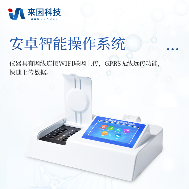 可快速检测各类食品中的甲醛、吊白块、二氧化硫、亚硝酸盐、双氧水、硼砂、农药残留、乳及乳制品中蛋白质的含量,仪器预留其他项目检测程序和端口,根据日后需求可方便的自主增加检测项目。